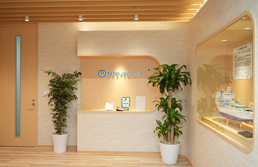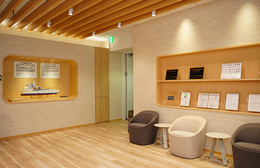 会社の顔となる受付は、木目調の温かみのあるデザイン。パーパスの“つながり”をテーマに、緩やかな曲線で、シームレスな人や組織の繋がりを表現しています。
